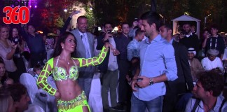 Tennis player Novak Djokovic shaking his legs with belly dancer